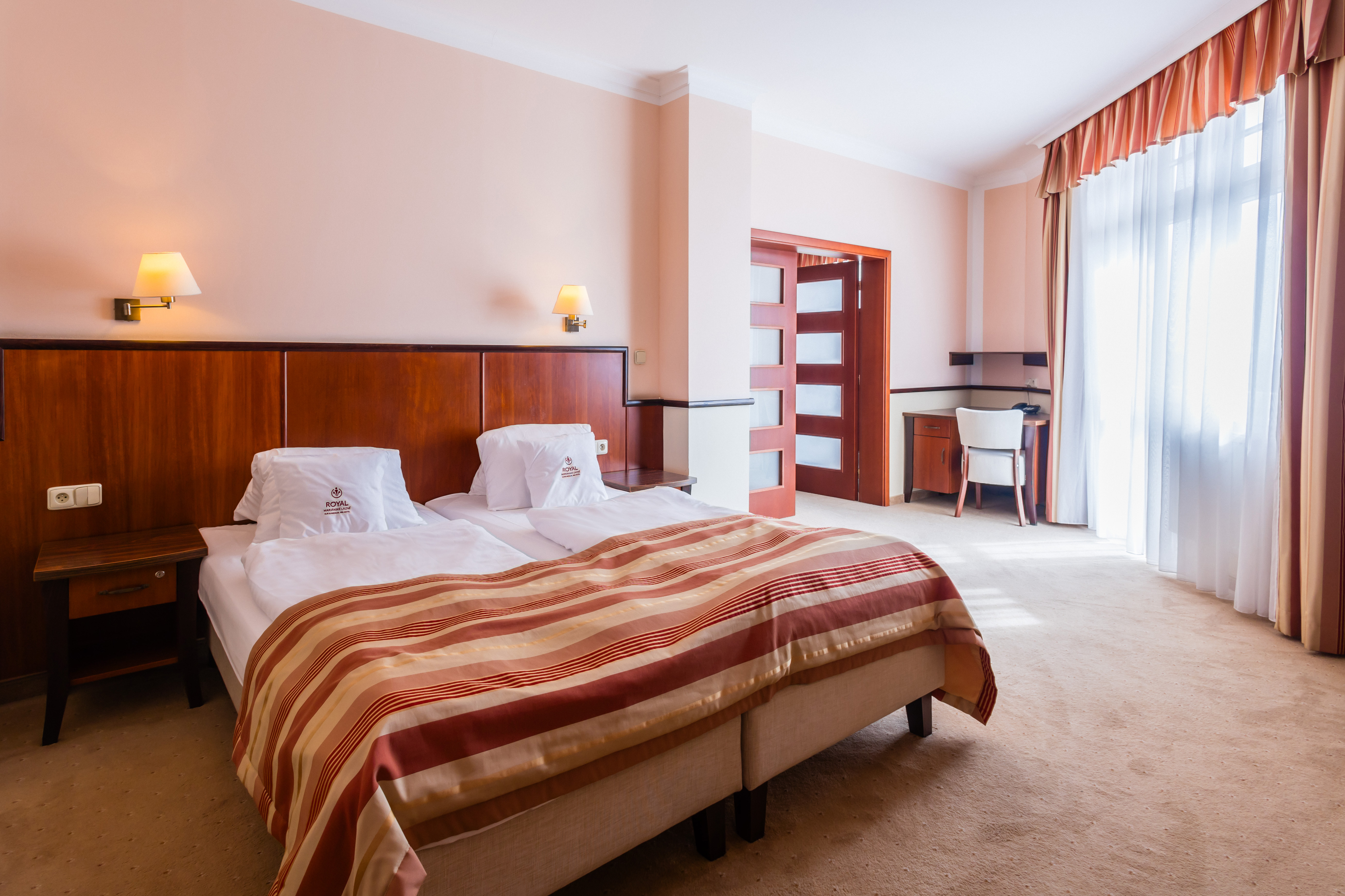 • Hosté mají neomezený vstup do wellness centra v partnerském hotelu ROYAL, kde si mohou dopřát regeneraci a příjemný odpočinek, a mohou volně využívat bazén, Whirlpool a parní lázeň. Župan, ručníky a hotelovou kosmetiku naleznete v pokoji a jsou během pobytu k dispozici zdarma. Fén pouze v pokojích Superior.